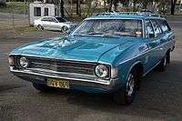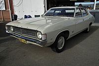 Sold between March 1972 and September 1973, the XA series was the first Falcon to be designed (with assistance from Ford's US headquarters) and manufactured in Australia.[3] It featured an entirely new body which was larger and more roomy than that of its XY series predecessor, giving it the "coke-bottle" look.[3] The XA range also had a longer list of options, although the choice of engines carried over from the previous XY Falcon range. All V8 302 CID and most 351 CID "Cleveland" engines were now Aussie made. GT Falcons could have Aussie or imported 351 CID V8s fitted.[4] Wagons, utilities and panel vans now featured a longer wheelbase than the sedan. Fairmont wagons had a dual-action tailgate that could be opened either downwards or sideways, optional on base model Falcon and Falcon 500 Wagons.[4]