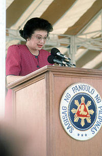 In February 1986, Aquino's widow, Corazon Aquino, ran for president against Marcos. The U.S. and UK sent official delegations to monitor the election. However, when U.S. observers reported widespread election fraud and violence on the part of the Marcos campaign, Reagan turned a blind eye and declared the U.S. neutral.[73] One observer, Sen. Richard Lugar, reported that the Marcos government was trying to juggle the vote count.[73] Lugar, along with Sen. Bob Dole and Sam Nunn, publicly protested the president's indifference.[73] On February 22–25, thousands of citizens took to the streets in a series of demonstrations known as the People Power Revolution. In response, Filipino military and government leaders abandoned Marcos.[73] The Reagan administration swiftly shifted to pressuring Marcos to step down so as to ensure the peaceful transition of power.[74] Corazon Aquino's taking office as president marked the restoration of democracy in the country, and the U.S. recognized the Aquino government on Feb. 25. Still, Reagan's stubborn defense of Marcos strained relations.