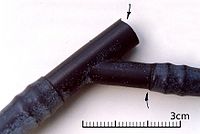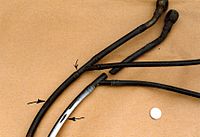The broken fuel pipe shown at left caused a serious accident when diesel fuel poured out from a van onto the road. A following car skidded and the driver was seriously injured when she collided with an oncoming lorry. Scanning electron microscopy or SEM showed that the nylon connector had fractured by stress corrosion cracking (SCC) due to a small leak of battery acid. Nylon is susceptible to hydrolysis when in contact with sulfuric acid, and only a small leak of acid would have sufficed to start a brittle crack in the injection moulded nylon 6,6 connector by SCC. The crack took about 7 days to grow across the diameter of the tube. The fracture surface showed a mainly brittle surface with striations indicating progressive growth of the crack across the diameter of the pipe. Once the crack had penetrated the inner bore, fuel started leaking onto the road.