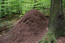 F. polyctena, among other social insects, has developed strategies to maintain a stable interior nest temperature despite temperature fluctuations outside. Nest moisture, solar radiation, heat produced by the metabolic activities of workers, and microbial activity in the nest material all contribute to nest thermoregulation. A stable temperature is especially crucial to the rate of development of larvae and pupae in the nest.[11] Additionally, it has been suggested that the particular construction of the F. polyctena nests allows them to have excellent heat capacity, despite their low density and low heat capacity materials. Essentially, the outer layer of nests consists of pine needles, sap and buds, that absorbs a large amount of solar radiation. The inner core of the nest consists of mostly twigs that act like a thermal "sponge," which external heat is funneled into.[12]