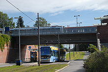 By 1994, the tram route to the new hospital appeared to have political support,[2] but by 1996 local politicians instead wanted to use Gaustad Station and buses to serve the hospital. There also arose a disagreement between the city and the state as to who should be paying for the light rail line, should it should be built.[3] Not until 1998 were the necessary political agreements in place to allow construction to start.[4][5] The new light rail started services on 1 June 1999,[6] and the rapid transit station opened on 22 August.[7] With the opening, line 4 was extended from Blindern, via Forskningsarken, to Ullevål stadion.[8] There were complaints from local residents that the increased traffic on the line was causing too much noise, and neighbors demanded that noise shields be built.[9] On 20 August 2003, the Ring Line of the metro opened, and line 4 started to also serve Nydalen and Storo.[7]