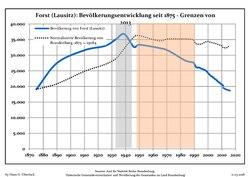 Development of population since 1875 within the current Boundaries (Blue Line: Population; Dotted Line: Comparison to Population development in Brandenburg state; Grey Background: Time of Nazi Germany; Red Background: Time of communist East Germany)