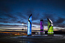 A trident of light towers varying between 5 to 7 m (16 to 23 ft) in height can be seen by passengers before the main terminal entrance. The three towers are illuminated after sunset with colours similar to the aurora borealis. YMM also has two 9 m (30 ft) illuminated welcome signs with a replica of a Canadian Forces Snowbirds aircraft.[24]