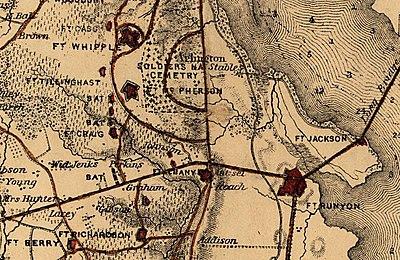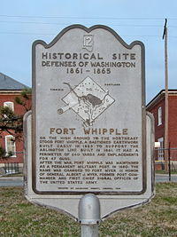 Following the Union Army's defeat at the Second Battle of Bull Run (Manassas) in August 1862, the Army constructed Fort Whipple on the grounds of the former Arlington estate during the spring of 1863. The fort was located a short distance southeast of Fort Cass. The Army named the fort after Brevet Major General Amiel Weeks Whipple, who died in May 1863 of wounds received during the Battle of Chancellorsville.[9] The fort was considered to be one of the strongest fortifications erected for the defense of Washington during the Civil War.[9][10] It had a perimeter of 658 yards and places for 43 guns.[10][11]