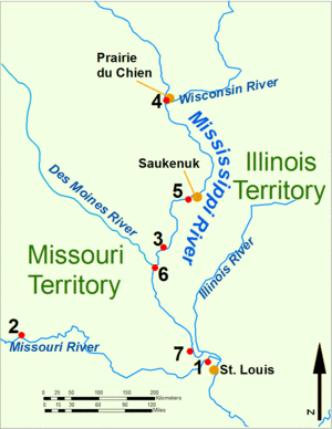 Fort Osage (also known as Fort Clark or Fort Sibley) was an early 19th-century factory trading post system run by the United States Government, on the American frontier being located in present-day Sibley, Missouri. The Treaty of Fort Clark was signed with certain members of the Osage Nation in 1808 calling for the creation of Fort Osage. It was one of three forts established by the U.S. Army to establish control over the newly acquired Louisiana Purchase territories. Fort Madison in SE Iowa was built to control trade and pacify Native Americans in the Upper Mississippi River region. Fort Belle Fontaine near St. Louis controlled the mouth of the Missouri.[4] The fort ceased operations in the 1820s as the Osage in subsequent treaties ceded the rest of their land in Missouri. A replica of the fort was rebuilt on the site between 1948 and 1961. The Fort Osage school district (including Fort Osage High School), which serves northeast Independence and the surrounding area, was named after it.