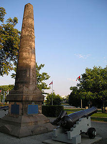 The obelisk is flanked by a cannon and a mortar, dating from the 1850s; they are all British. A second cannon, present on the west side of the obelisk as recently as 2005, has since been removed.