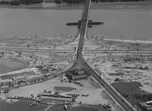 Two years later, a new railroad bridge was constructed, replacing the old Long Bridge. In 1906, a highway bridge was constructed nearby. Together, these two projects destroyed what little remained of Fort Runyon. The approach routes to the bridges ran directly through the earthworks of the old fort, and these were leveled in order to provide smooth passage for trains and automobiles.[38] By 1941, when ground was broken for work on the Pentagon, nothing remained of the fort. Today, Interstate 395 runs through the site of the fort, and Exit 9 from the interstate is at the approximate center of where Fort Runyon stood. A nearby historical marker erected by the Arlington Historical Society commemorates the fort's existence.