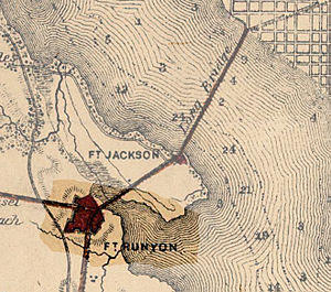 The land for the fort was appropriated from James Roach, a building contractor in Washington who was the second-largest landowner in the county, behind only the Lee family.[3] Soldiers tore up land, dug trenches, and used gardens for latrines. Roach's mansion on Prospect Hill was vandalized by Union forces during the construction of Fort Runyon, but survived the war and was demolished in 1965.[14] Other land for Fort Runyon and Fort Jackson came from the demolition of Jackson City, a collection of gambling establishments, saloons, and a racetrack that were located at the southern end of the Long Bridge.[15]