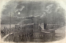 Over 13,000 men marched into northern Virginia on the 24th, bringing with them "a long train of wagons filled with wheelbarrows, shovels, &c."[9] These implements were put to work even as thousands of men marched further into Virginia. Engineer officers under the command of then-Colonel John G. Barnard accompanied the army and began building fortifications and entrenchments along the banks of the Potomac River in order to defend the bridges that crossed it.[11] By sunrise on the morning of the 24th, ground had already been broken on the first two forts comprising the Civil War defenses of Washington — Fort Runyon and Fort Corcoran.