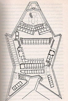 By 1417, the local militia had already established a permanent watch post on the tip of the Sciberras Peninsula.[1] In 1488, the Aragonese built a watchtower on Saint Elmo Point, and it was dedicated to Erasmus of Formia, better known as Saint Elmo. In 1533, the Order of Saint John reinforced the tower due to its strategic location.[2] In 1551, an Ottoman raid occurred in which the Turkish fleet sailed into Marsamxett Harbour unopposed. Due to this, it was decided that a major expansion was necessary, and in 1552 the tower was demolished and a new star fort began to be built. It was designed by a Spanish Engineer named Pietro Pardo.[3] It had a cavalier, a covertway and a tenaille. A ravelin was hastily constructed months before the 1565 siege.[4]