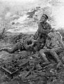 At the outbreak of the First World War, Matania became a war artist and was acclaimed for his graphic and realistic images of trench warfare. His painting for the Blue Cross entitled Goodbye, Old Man, showing a British soldier saying farewell to his dying horse, is a fine example of his emotive work.[2] His painting of the Green Howards including Henry Tandey is a central part of a famous story.[3]