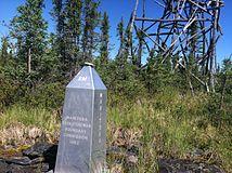 During the winter of 1961-1962 (37 years prior the formation of Nunavut), a survey crew led by Lionel E. Boutiler installed 85 survey monuments along the northernmost section of the Saskatchewan/Manitoba border.[4][5] The crew worked from south to north along the Second Meridian as defined in the system of Dominion Land Surveys. The final monument, designated #157, officially marked the intersection of the boundaries of Manitoba, Saskatchewan and the Northwest Territories. Unlike the standard survey monuments along the provincial and territorial borders, Monument 157 is an Aluminum obelisk that stands about one metre tall. Photos can be seen in the original survey report.[4] On the top of the monument is a cap that states "5 years imprisonment for removal".[3]