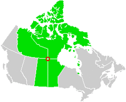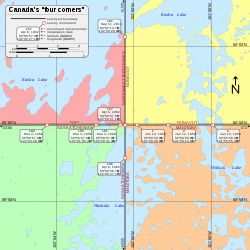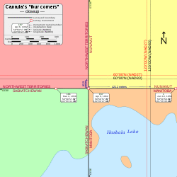 The four corners of Canadian political subdivisions meet at a point near 60° N 102° W.[1][2] These are the provinces of Manitoba and Saskatchewan and the territories of the Northwest Territories and Nunavut.[1]