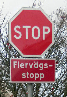 Few countries outside North America – least of all, those in Europe – have intersections at which all users must stop at all times; the conditions for stop sign placement may indeed preclude such an arrangement in many places.[9]:430 In Sweden all-way stops (Flervägsstopp) have been tested since the 1980s but are little used even though they are now permitted.[11] In the UK they have always been very uncommon and were formally prohibited by the Department for Transport in 2002.[12][13]