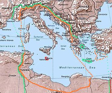 The term 4th Shore derives from the geography of Italy being a long and narrow peninsula jutting into the Mediterranean with two principle shorelines, the First Shore on the east along the Adriatic Sea and the Second Shore on the west along the Tyrrhenian Sea. The Adriatic Sea's opposite southern Balkans shore, with Dalmatia, Montenegro, and Albania, was planned for Italian expansion as the Third Shore, with Libya on the Mediterranean Sea becoming the fourth.[1] Thus the 4th Shore was the southern part of Greater Italy, an early 1940s Fascist project of enlarging Italy's national borders around the Italy's Mare Nostrum.