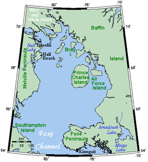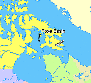 Foxe Basin is a shallow oceanic basin north of Hudson Bay, in Nunavut, Canada, located between Baffin Island and the Melville Peninsula. For most of the year, it is blocked by sea ice (fast ice) and drift ice made up of multiple ice floes.