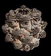 Notable fractal artists include Desmond Paul Henry, Hamid Naderi Yeganeh, and musician Bruno Degazio. The British artist William Latham, has used fractal geometry and other computer graphics techniques in his works.[12] Greg Sams has used fractal designs in postcards, T-shirts, and textiles. American Vicky Brago-Mitchell has created fractal art which has appeared in exhibitions and on magazine covers. Scott Draves is credited with inventing flame fractals. Carlos Ginzburg has explored fractal art and developed a concept called "homo fractalus" which is based around the idea that the human is the ultimate fractal.[13] Merrin Parkers from New Zealand specialises in fractal art.[14] Kerry Mitchell wrote a "Fractal Art Manifesto", claiming that[15]