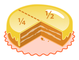 In positive common fractions, the numerator and denominator are natural numbers. The numerator represents a number of equal parts, and the denominator indicates how many of those parts make up a unit or a whole. The denominator cannot be zero, because zero parts can never make up a whole. For example, in the fraction 3&fras1;4, the numerator 3 tells us that the fraction represents 3 equal parts, and the denominator 4 tells us that 4 parts make up a whole. The picture to the right illustrates or 3&fras1;4 of a cake.
