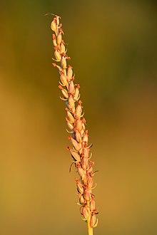 The inflorescence is 5–25 centimetres (2.0–9.8 in) long and it is composed of flowers gathered in dense cylindrical spikes (up to 50 flowers per spike). These inflorescences are scented and genes underlying eugenol (a volatile scent compound) production have been identified in Gymnadenia conopsea, G. odoratissima and G. densiflora.[1] The flowers are petiolated, placed in the axils of long bracts and reach on average 0.8–1.4 centimetres (0.31–0.55 in). They have a distinctive three lobed lip and long spurs. Their light scent is similar to cloves. Their colors vary from white and pink to pink-purple, more rarely white. These flowers bloom in the Summer, from June to July. They are hermaphrodite and pollinated by insects (entomophily), including moths.