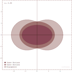 where the purely radial component grr of the metric goes to infinity. The outer surface can be approximated by an oblate spheroid with lower spin parameters, and resembles a pumpkin-shape[43][44] with higher spin parameters. It touches the inner surface at the poles of the rotation axis, where the colatitude θ equals 0 or π; its radius in Boyer-Lindquist coordinates is defined by the formula