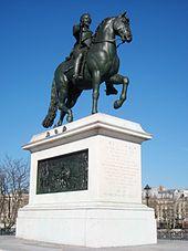 Lemot also provided the bronze bas-relief panels for its pedestal; the sculpture (illustration) was unveiled 25 August 1818.[4] Lemot also created an Equestrian Monument of Louis XIV that provides the focal point of Place Bellecour, Lyon, where a street bears his name. At 18 meters, it was the largest bronze casting of its time.[5]