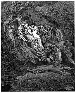 In the first volume of The Divine Comedy, Dante and Virgil meet Francesca and her lover Paolo in the second circle of hell, reserved for the lustful. Here, the couple are trapped in an eternal whirlwind, doomed to be forever swept through the air just as they allowed themselves to be swept away by their passions. Dante calls out to the lovers, who are compelled briefly to pause before him, and he speaks with Francesca. She obliquely states a few of the details of her life and her death, and Dante, apparently familiar with her story, correctly identifies her by name. He asks her what led to her and Paolo's damnation, and Francesca's story strikes such a chord within Dante that he faints out of pity.