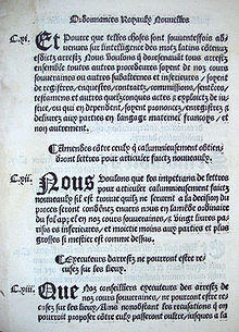 Francis' attitude towards Protestantism changed for the worse following the "Affair of the Placards", on the night of 17 October 1534, in which notices appeared on the streets of Paris and other major cities denouncing the Catholic mass. The most fervent Catholics were outraged by the notice's allegations. Francis himself came to view the movement as a plot against him and began to persecute its followers. Protestants were jailed and executed. In some areas whole villages were destroyed. In Paris, after 1540, Francis had heretics such as Etienne Dolet tortured and burned.[37] Printing was censored and leading Protestant reformers such as John Calvin were forced into exile. The persecutions soon numbered thousands of dead and tens of thousands of homeless.[38]