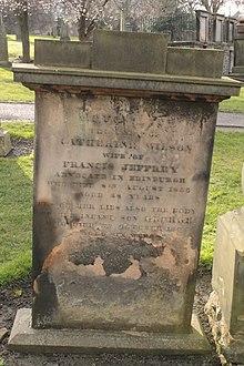 Francis Jeffrey's first wife, Catherine Wilson, died 8 August 1805, aged only 28, and is buried in Greyfriars Kirkyard, with their infant child George (d.1802). His brother, John Jeffrey (1775-1848) is also buried there.[5]