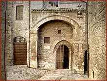 Such an incident is alluded to in a scene in the late 13th-century fresco cycle, attributed to Giotto, in the upper basilica at Assisi (see accompanying illustration).[30] It has been suggested that the winged figures atop the columns piercing the roof of the building on the left of the scene are not idols (as Erwin Panofsky had proposed) but are part of the secular iconography of the sultan, affirming his worldly power which, as the scene demonstrates, is limited even as regards his own "priests" who shun the challenge.[31][32] Although Bonaventure asserts that the sultan refused to permit the challenge, subsequent biographies went further, claiming that a fire was actually kindled which Francis unhesitatingly entered without suffering burns. The scene in the fresco adopts a position midway between the two extremes.