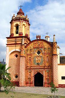 The Santiago mission in Jalpan was established before the arrival of Junípero Serra in 1744, but Serra was in charge of building the mission complex that stands today from 1751 to 1758, the first to be built. It is dedicated to James the Greater, the first evangelist.[5][11] This complex is situated in the center of the modern town in front of the main plaza and formed by an atrium, cloister, pilgrim portal and church, with a chapel annex on the left side. The original atrium wall was lost, but reconstructed in the same style, with three portals and inverted arches.[3] The main features of the ornate portal on the facade are Our Lady of the Pillar and the Virgin of Guadalupe, both with Mesoamerican connections, as well as a double headed eagle, meant to symbolize the blending of the two cultures.[5]