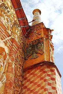 The facade is elaborately done in stucco and stone work, with ochre of the pilasters contrasting with the yellow of many of the decorative details. Much of the detail is vegetative, along with small angels and eagles.[13] European elements include images of saints such as Saint Dominic and Francis of Assisi and the Franciscan coat of arms. Inside the door, there are the images of Saints Peter and Paul. Native elements include a double-headed Mexican eagle devouring a serpent. On the upper left, there is an image of the Virgin of Guadalupe on the upper left, the Our Lady of the Pillar. These are the virgin images of Mexico and Spain respectively. This statue is said to have been taken by a general at the end of the 19th century. It was replaced by a more modern clock.[13][14] Inside, the cupola of the Jalpan mission contains scenes of the appearance of the Virgin of Guadalupe.[13][14][15]