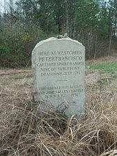 Peter Francisco was a private who served in several units during the war. He was a striking figure, reported to be about six feet six inches (about 198 cm) and over 260 pounds (120 kg), and was known for his strength. In the northern campaigns, he was in the battles at Brandywine and Monmouth Court House, and supposedly was the second man in the fortifications during the Battle of Stony Point.[2] He then served in the southern army under General Greene, where he was reported to have killed 11 men during the May 1781 Battle of Guilford Courthouse.[3] He was also injured in that battle, and had returned to his home in Buckingham, Virginia to recuperate.[2]