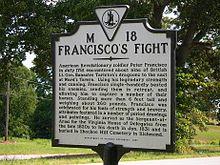 Francisco's Fight is the name commonly given to an alleged skirmish between a detachment of Tarleton's Raiders and Peter Francisco, a Continental Army soldier with a long service record, during the American Revolutionary War in July 1781. The skirmish, which is only known to be documented by Francisco, resulted in the death of at least one man and the wounding of several others.