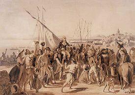 General Miranda then marched on and captured Santa Ana de Coro, but found no support from the city residents.[6] However, on 8 August a Spanish force of almost 2000 men arrived. They captured a master of transport and 14 seamen who were getting water, unbeknownst to Lieutenant Donald Campbell. HMS Lilly landed 20 men on the morning of 10 August; this landing party killed a dozen Spaniards, but was able to rescue only one of the captive seamen. Colonel Downie and 50 men were sent, but the colonel judged the enemy force too strong and withdrew. When another 400 men came from Maracaibo, General Miranda realized that his force was too small to achieve anything further or to hold Coro for long. On August 13, Miranda ordered his force to set sail again. HMS Lilly and her squadron then carried him and his men safely to Aruba.[6][10]