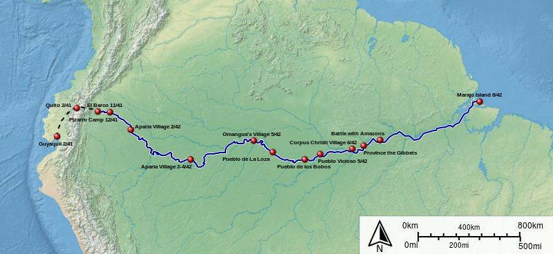 After leaving the village on the Napo, Orellana continued downstream to the Amazon. The 49 men began to build a bigger ship for river navigation. During their navigation on Napo River they were threatened constantly by the Omaguas. They reached the Negro River on 3 June 1542 and finally arrived on the Amazon River.