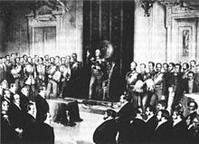 The Parliament then dispatched a deputation to the Archduke to present the honor bestowed upon him. However, the Confederate Diet (Bundesversammlung) sent their own letter, which the Archduke received prior to the parliamentary deputation, informing him that the princes of the Confederation had nominated him Regent before the Parliament had done so.[20] The implication was that the Regent should receive his power from the princes rather than the revolutionaries, but the practical effect of this power was yet to seen.