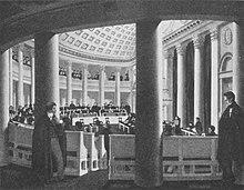 Because of this composition, the National Assembly was later often dismissively dubbed the Professorenparlament ("Professors' parliament") and ridiculed with verses such as "Dreimal 100 Advokaten – Vaterland, du bist verraten; dreimal 100 Professoren – Vaterland, du bist verloren!"[17] "Three times 100 lawyers – Fatherland, you are betrayed; three times 100 professors – Fatherland, you are doomed".