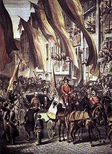 Between 1846 and 1848, broader European developments aggravated this tension. The Peasant Uprising in Galicia in February and March 1846 was a revolt against serfdom, directed against manorial property and oppression.[5] Rioting Galician peasants killed some 1,000 noblemen and destroyed about 500 manors.[6] Despite its failure, the uprising was seen by some scholars, including Karl Marx, as a "deeply democratic movement that aimed at land reform and other pressing social questions."[7] The uprising was praised by Marx and Friedrich Engels for being "the first in Europe to plant the banner of social revolution", and seen as a precursor to the coming Spring of Nations.[7][8] At the same time, the suppression of the Free City of Cracow in the midst of the uprising aroused the emotions of nationalists in Germany as much as in Poland.