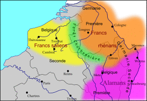 - ^ a b c de Vries, Jan W., Roland Willemyns and Peter Burger, Het verhaal van een taal, Amsterdam: Prometheus, 2003, pp. 12, 21–27. On page 25: "…Een groot deel van het noorden van Frankrijk was in die tijd tweetalig Germaans-Romaans, en gedurende een paar eeuwen handhaafde het Germaans zich er. Maar in de zevende eeuw begon er opnieuw een romaniseringsbeweging en door de versmelting van beide volken werd de naam Franken voortaan ook gebezigd voor de Romanen ten noordern van de Loire. Frankisch of François werd de naam de (Romaanse) taal. De nieuwe naam voor de Germaanse volkstaal hield hiermee verband: Diets of Duits, dat wil zeggen "volks", "volkstaal". [At that time a large part of the north of France was bilingual Germanic/Romance, and for a couple of centuries Germanic held its own. But in the seventh century a wave of romanisation began anew and because of the merging of the two peoples the name for the Franks was used for the Romance speakers north of the Loire. "Frankonian/Frankish" or "François" became the name of the (Romance) language. The new name for the Germanic vernacular was related to this: "Diets"" or "Duits", i.e. "of the people", "the people's language"]. Page 27: "…Aan het einde van de negende eeuw kan er zeker van Nederlands gesproken worden; hoe long daarvoor dat ook het geval was, kan niet met zekerheid worden uitgemaakt." [It can be said with certainty that Dutch was being spoken at the end of the 9th century; how long that might have been the case before that cannot be determined with certainty.]
