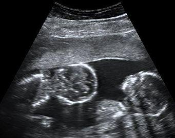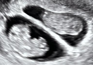 Abdominal ultrasonography of monoamniotic twins at a gestational age of 15 weeks. There is no sign of any membrane between the fetuses. A coronal plane is shown of the twin at left, and a sagittal plane of parts of the upper thorax and head is shown of the twin at right.