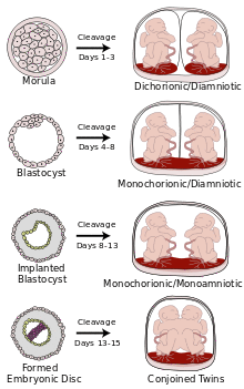 Conjoined twins | When the division of the developing zygote into 2 embryos occurs, 99% of the time it is within 8 days of fertilization. Mortality is highest for conjoined twins due to the many complications resulting from shared organs. | If the division of the zygote occurs later than the 12 days then conjoined twins are usually the result. |