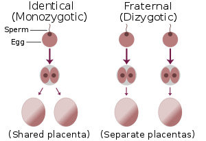 Twins are two offspring produced by the same pregnancy.[1] Twins can be either monozygotic ('identical'), meaning that they develop from one zygote, which splits and forms two embryos, or dizygotic ('non-identical' or 'fraternal'), meaning that each twin develops from a separate egg and each egg is fertilized by its own sperm cell.[2]