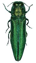 The emerald ash borer (Agrilus planipennis, EAB) is a wood-boring beetle accidentally introduced to North America from eastern Asia via solid wood packing material in the late 1980s to early 1990s. It has killed tens of millions of trees in 22 states in the United States[20] and adjacent Ontario and Quebec in Canada. It threatens some seven billion ash trees in North America. Research is being conducted to determine if three native Asian wasps that are natural predators of EAB could be used as a biological control for the management of EAB populations in the United States. The public is being cautioned not to transport unfinished wood products, such as firewood, to slow the spread of this insect pest.[21]