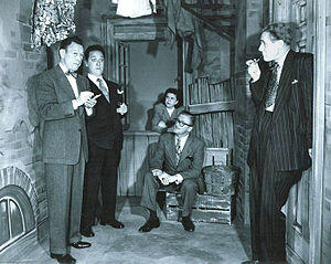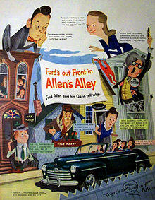 His best-remembered gag was his long-running mock feud with friend and fellow comedian Jack Benny, but it was only part of his appeal; radio historian John Dunning (in On the Air: The Encyclopedia of Old-Time Radio) wrote that Allen was perhaps radio's most admired comedian and most frequently censored.[3] A master ad libber, Allen often tangled with his network's executives (and often barbed them on the air over the battles) while developing routines whose style and substance influenced fellow comic talents, including Groucho Marx, Stan Freberg, Henry Morgan and Johnny Carson; his avowed fans also included President Franklin D. Roosevelt, humorist James Thurber, and novelists William Faulkner, John Steinbeck and Herman Wouk (who began his career writing for Allen).