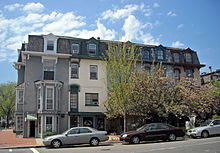 On September 3, 1838, Douglass successfully escaped by boarding a northbound train of the Philadelphia, Wilmington and Baltimore Railroad.[39] The area where he boarded was a short distance east of the train depot, in a recently developed neighborhood between the modern neighborhoods of Harbor East and Little Italy. The depot was located at President and Fleet streets, east of "The Basin" of the Baltimore harbor, on the northwest branch of the Patapsco River.