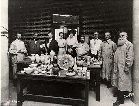 Emigrants from Stoke-on-Trent, where ceramics was the dominant industry, tended to settle in such places as Trenton, New Jersey, or, as in Frederick Rhead's case, Ohio. Both areas had pottery industries to exploit the clay deposits. Rhead's first USA position was managing a small art pottery at Tiltonville, Ohio, which changed its name from Vance Faience to Avon Faience in 1902.[3] Pieces from Rhead's time at this pottery rarely come on the market.[4] Production at Tiltonville was being transferred to nearby Wheeling, and in 1904, Rhead left to work as a designer for the Weller pottery in Zanesville, Ohio, but he did not stay there long. In 1904, Rhead became art director at the Roseville Pottery in Zanesville. Roseville was a large pottery which produced some art pottery as well as more utilitarian lines.[5] In 1908 the company reduced the amount of handcrafting in its production, and the following year Rhead moved to University City, Missouri, although his brother Harry stayed on at Roseville.