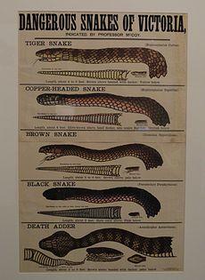 Frederick McCoy described three species of Australia's venomous snakes during 1878–1879,[14] including Oxyuranus microlepidotus, commonly known as the inland taipan or fierce snake, which is considered to be the world's most venomous snake.[15]