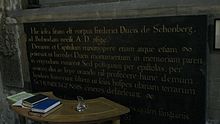 Hic infra situm est corpus Frederici Ducis de Schonberg, ad Bubindam occisi, A.D. 1690. Decanus et Capitulum maximopere etiam atque etiam petierunt, ut haeredes Ducis monumentum in memoriam parentis erigendum curarent. Sed postquam per epistolas, per amicos, diu ac saepe orando nil profecere; hunc demum lapidem statuerunt; saltem ut scias, hospes, ubinam terrarum SCHONBERGENSIS cineres delitescunt. Plus potuit fama virtutis apud alienos quam sanguinis proximitas apud suos. A.D. 1731