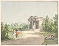 The Apis Temple is located on the border to Copenhagen Zoo. It was designed in the style of a Roman temple by the painter Nicolai Abildgaard and built in 1802. It is named for the Egyptian bull-deity Apis which is depicted on the frontispice. The temple front consists of 10 columns of which 8 are recycled from a rebuilding of Moltke's Palace while the last 2 columns are replicas. Decorations include the Ox Cranium Frieze and the Bull Relief, both carved in sandstone.[6]