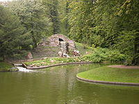 Another garden feature typical of the romantic garden is an artificial waterfall. The waterfall is 7 metres high and is partly created out of marble blocks from the building site of the Marble Church. The waterfall was left as a ruin for many years but was reconstructed in 2004.[12]